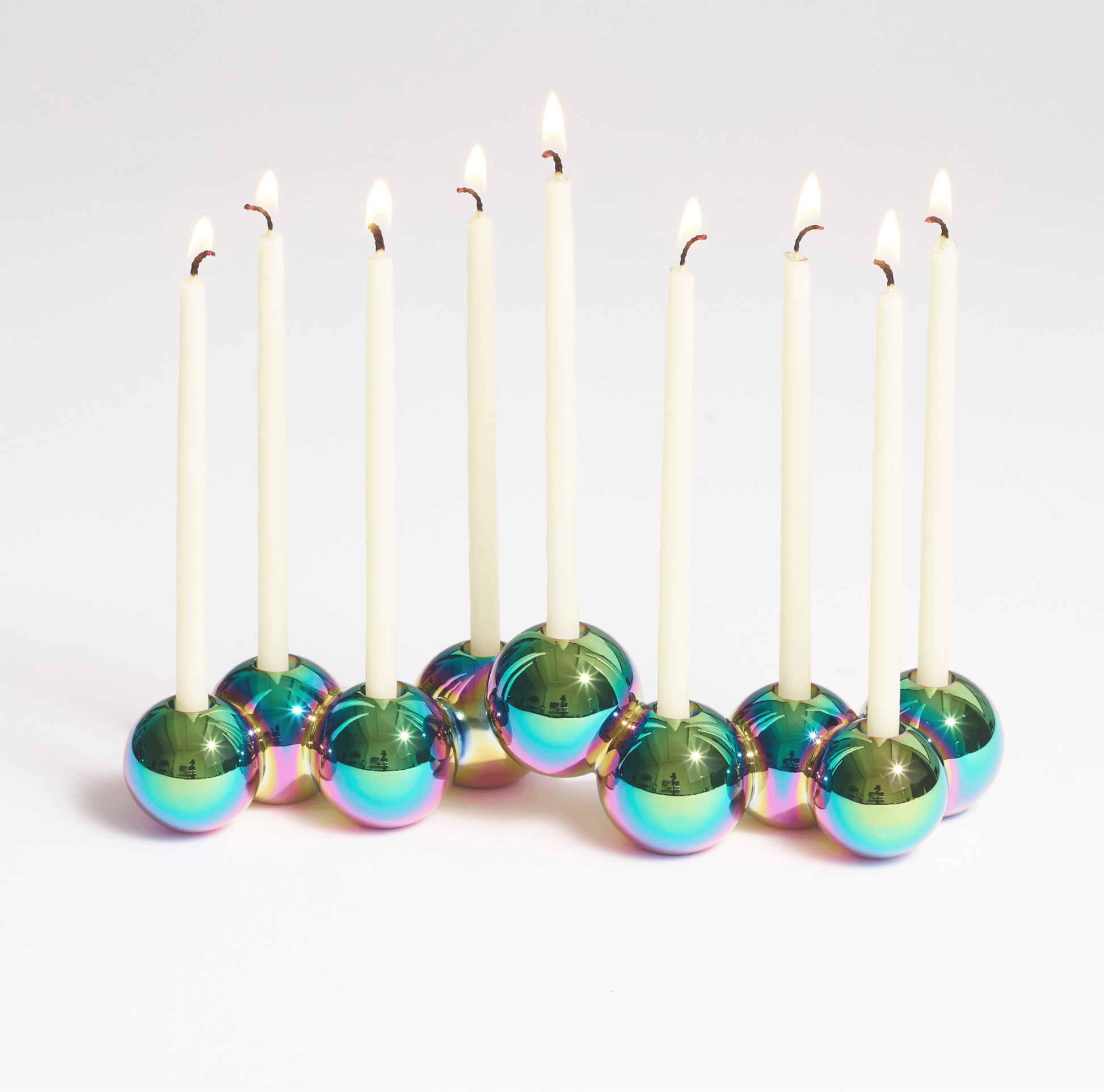 Light meets metallic art. Carved from a solid block of aluminum and polished by hand, this menorah catches candlelight—and attention. Elevate your celebrations with sleek design and shimmering presence.