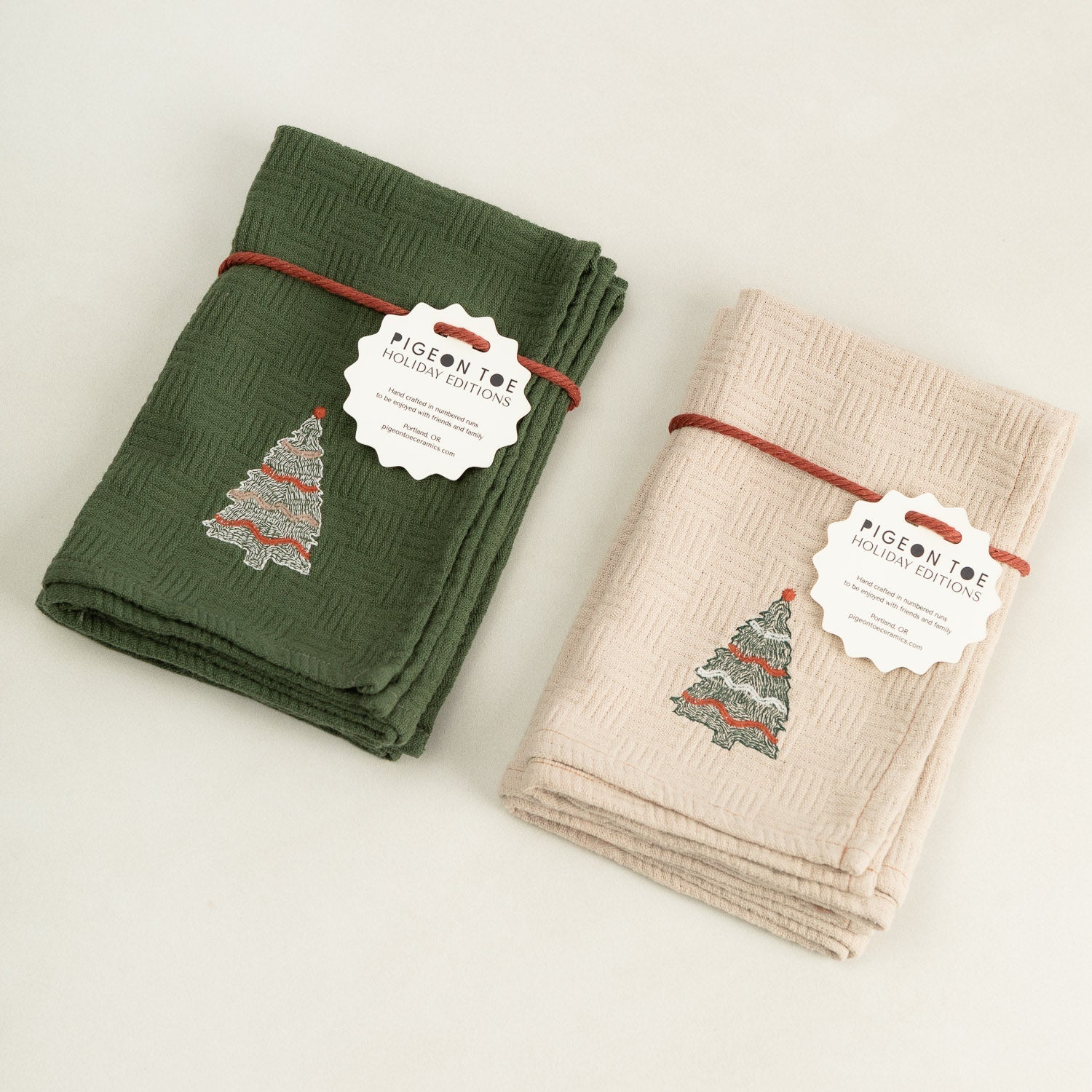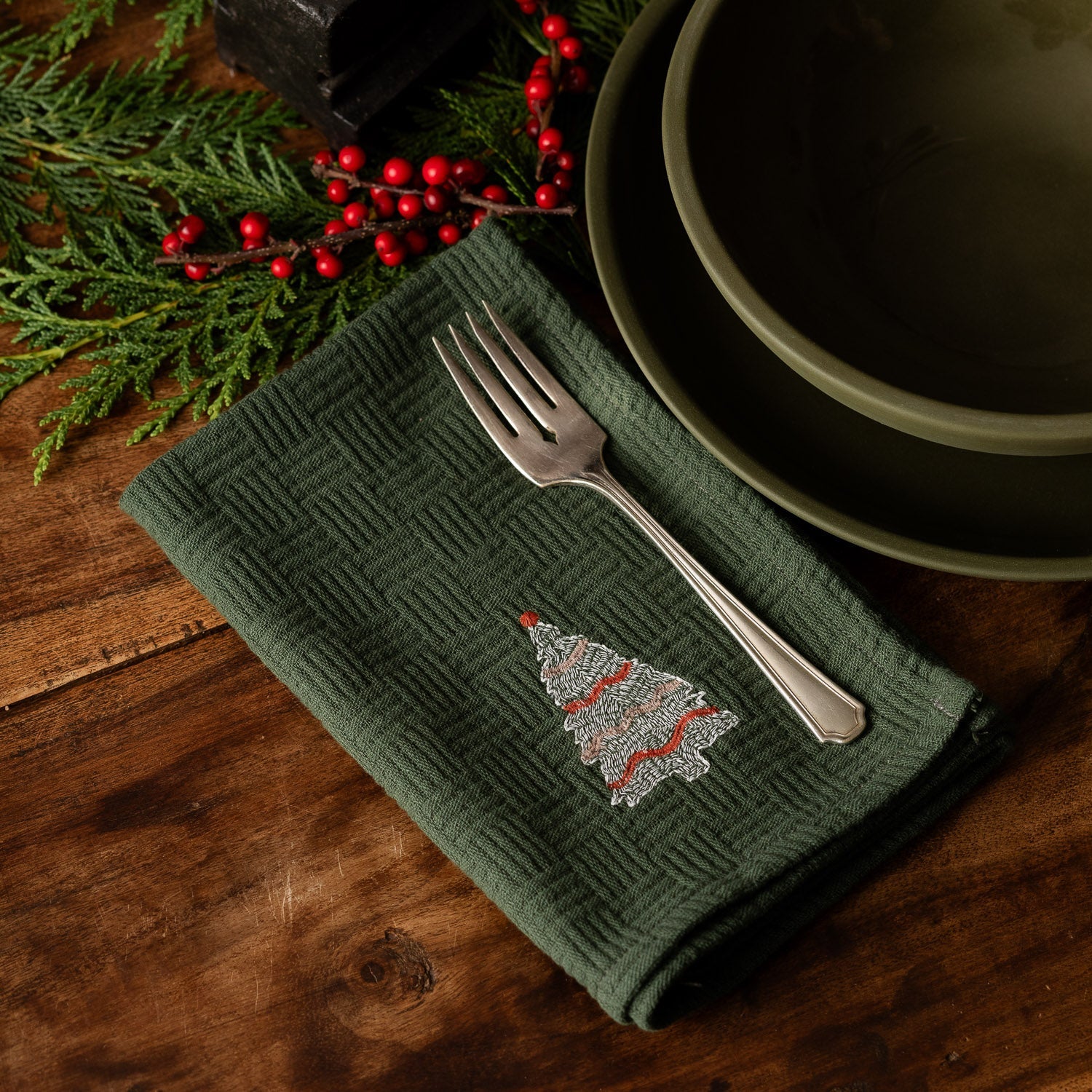 The Holiday House Napkin set begins with a heavyweight textured woven fabric and is finished with a charming winter tree motif- embroidered in small batches in Portland.