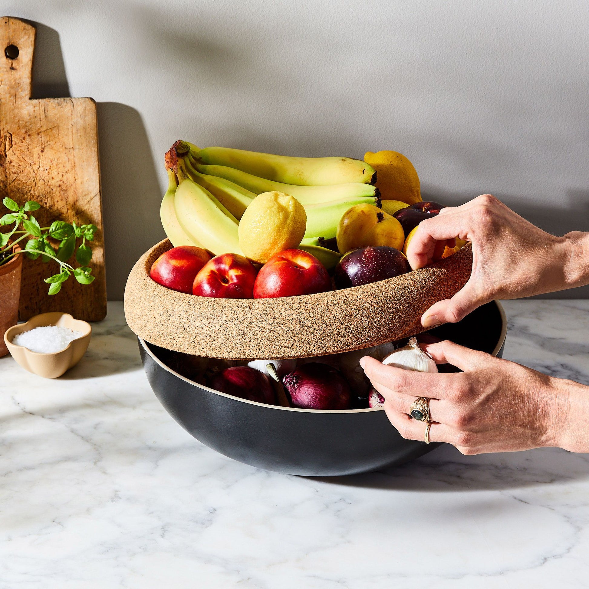 The fruit bowl just got a clever upgrade: This wonder has a dark, temperature-stable hiding spot for potatoes, onions, and not-quite-ripe fruits. And up top? There’s room for things that need to breathe, like bananas and avocados. The cork lid is inspired by an old trick of tossing wine corks into fruit bowls to absorb moisture and keep flies away—neat, huh?