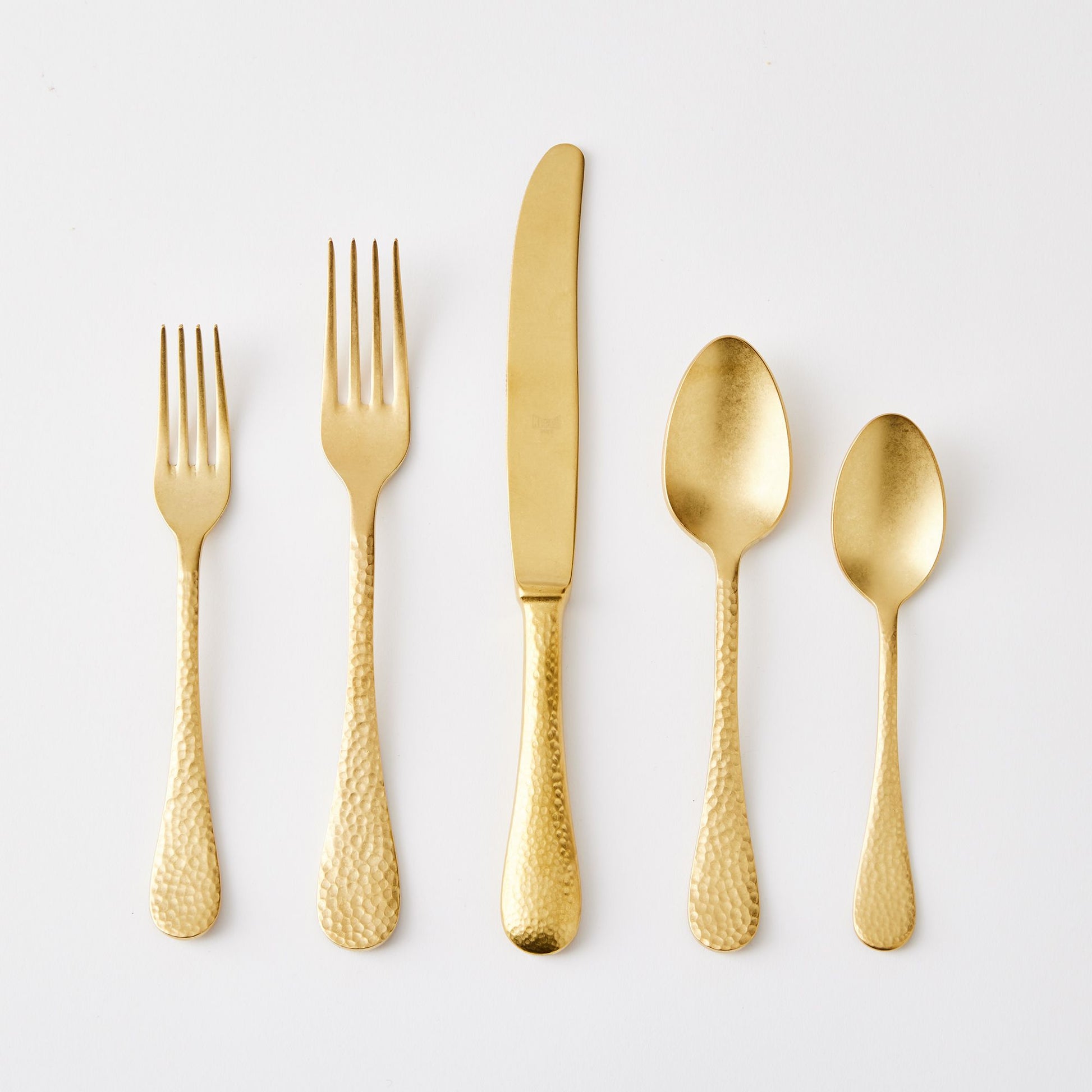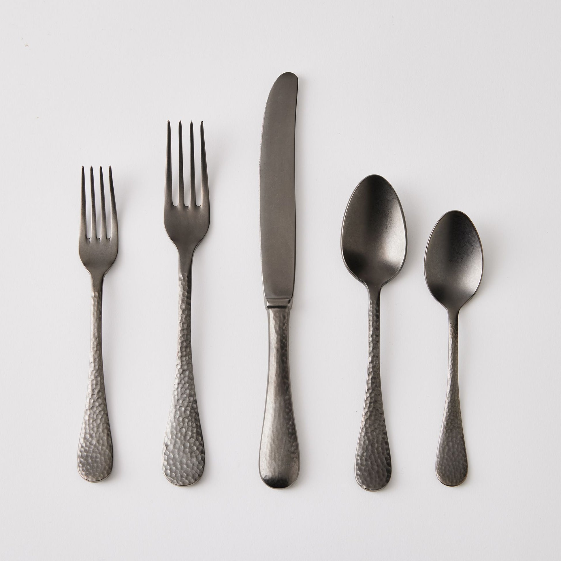 5-Piece Set: 1 place setting; includes 1 salad fork, 1 dinner fork, 1 dinner knife, 1 soup spoon, and 1 dessert spoon