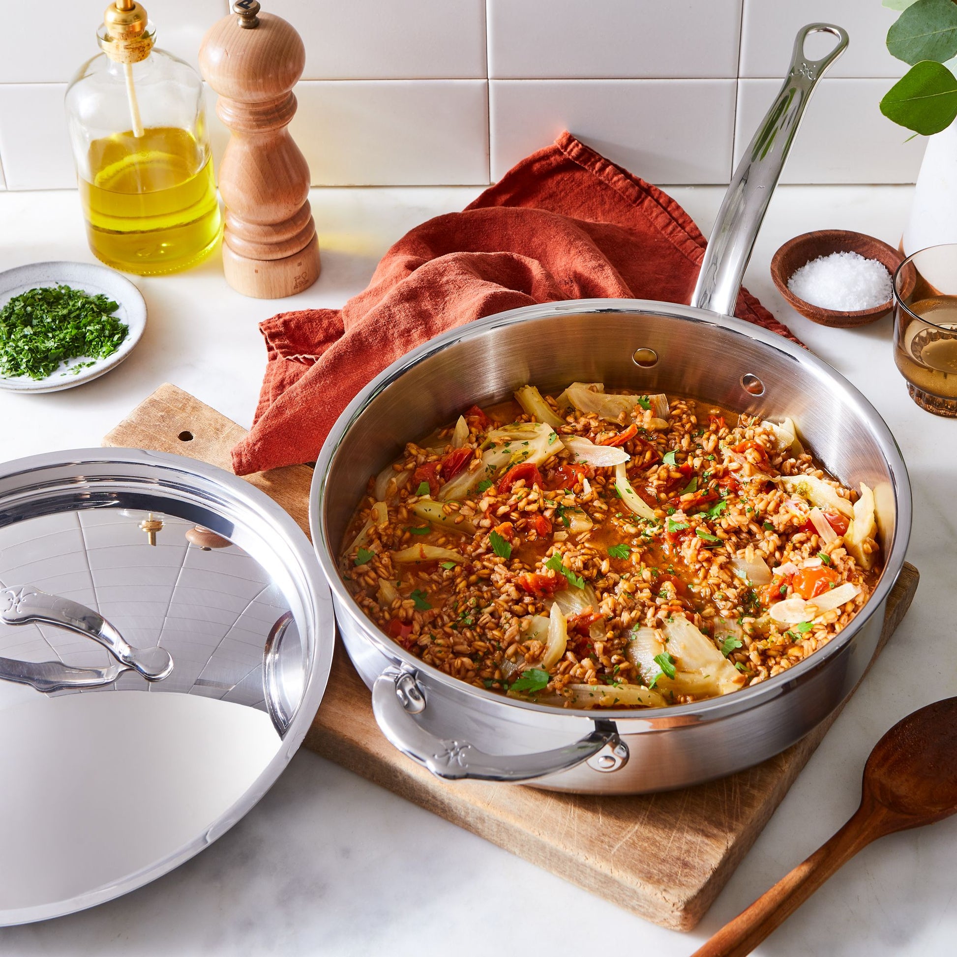 Sautéing is only the beginning. With its high sides and wide profile, this pan was built for it all (one-pot pasta, braised chicken, mussels...sky’s the limit, really). It’s cold-forged from triple-bonded stainless steel with a layer of aluminum tucked inside, so it heats up in a flash. Plus, it’s got an extra-thick base for ultra-even heat distribution. The flared sides mean you can pour without dripping, while the flush rivets make cleanup snappier than ever. Oh, and fun fact: This wonder was handcrafted in Italy—just another reason it’s getting bonus points.