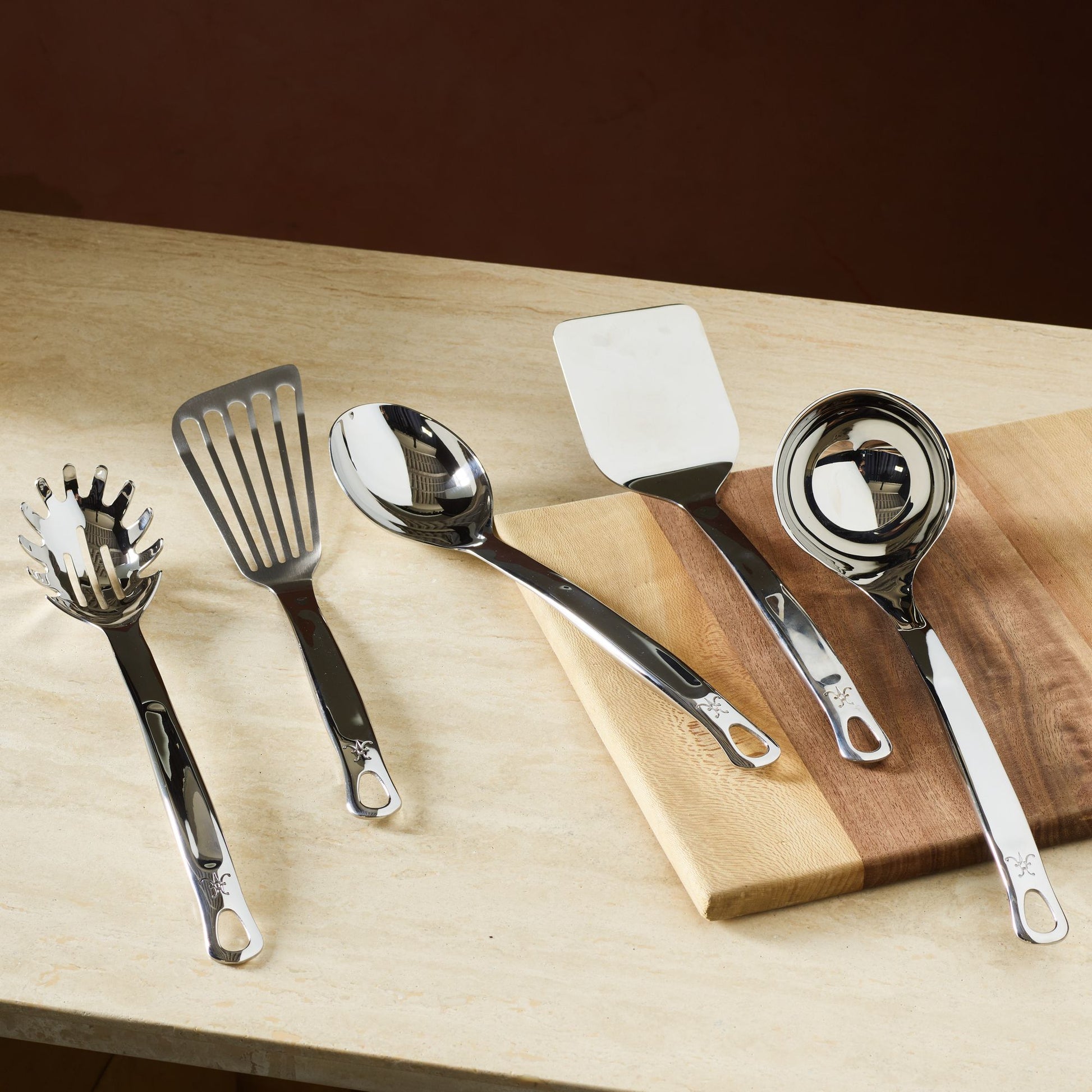 - 5-piece set includes deep spoon, ladle, pasta fork, turner, and fish spatula