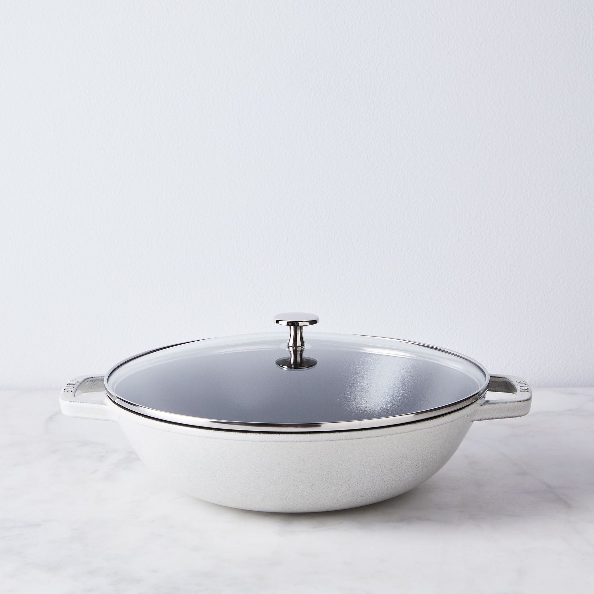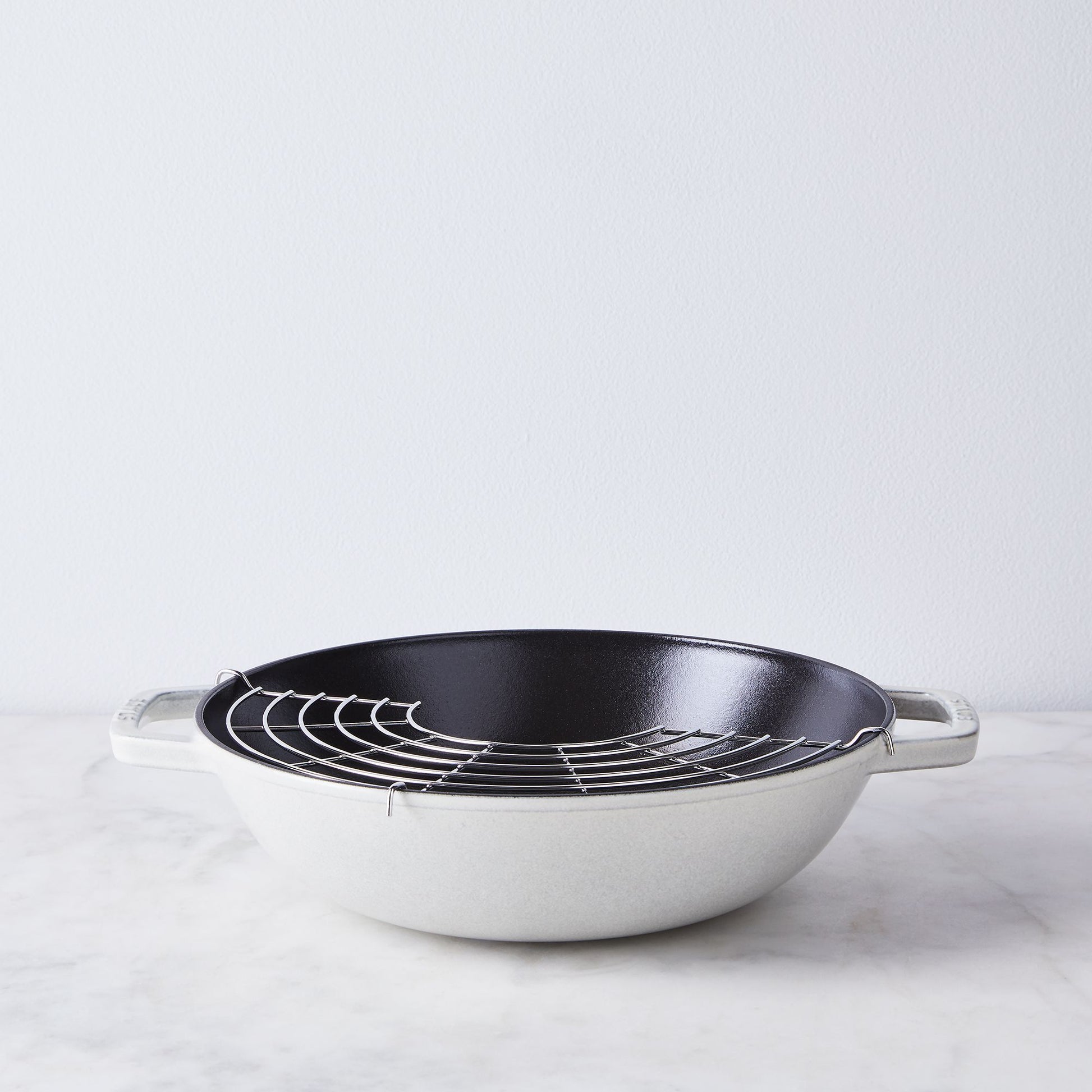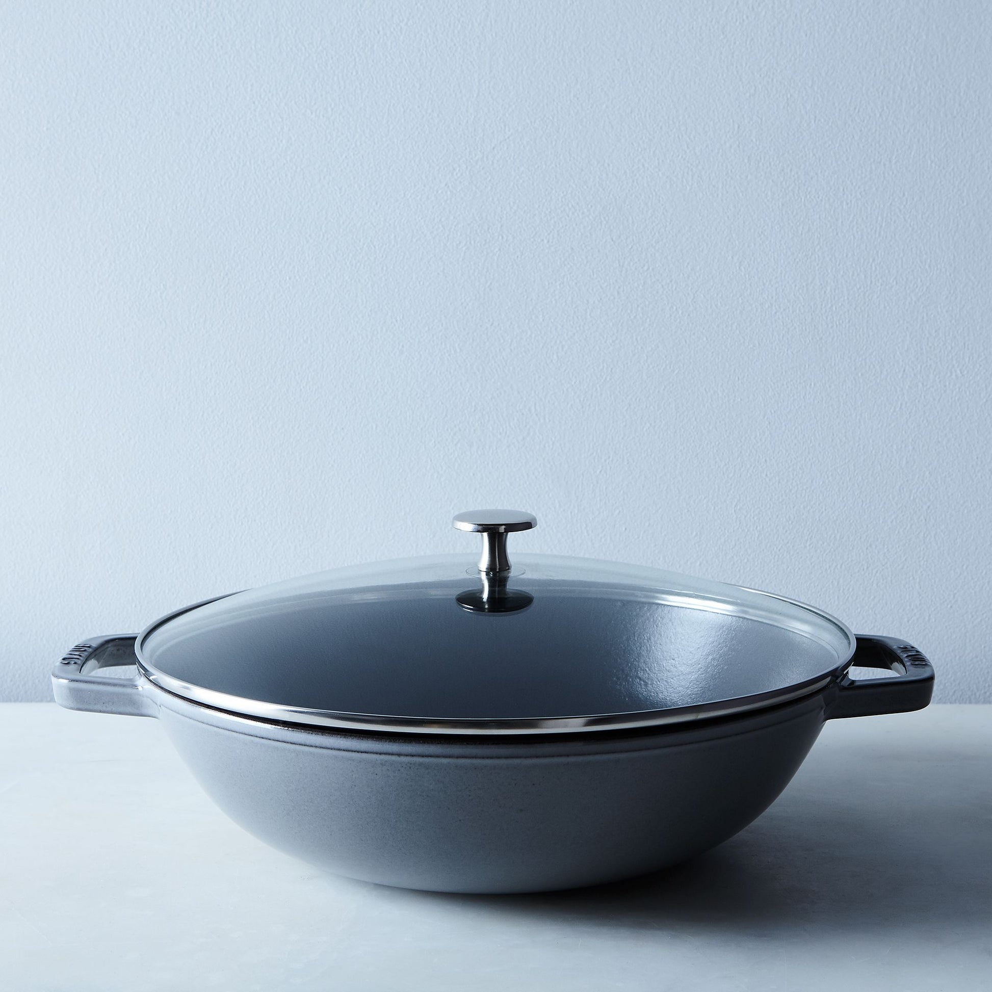 We’re inclined to think all of Staub’s pans are perfect, but we’re especially enamored of this enameled cast iron wok-shaped one. It’s just as aces at braising, roasting, and simmering as the Staub pots you know and love, but the pan’s wide, angled, 4.5-quart shape also makes it ideal for large-batch deep frying and vigorous stir-frying without spilling. Between batches, rest your foods on the included stainless steel rack—the oil drips right back into the pan, saving you from the plate–paper towel draining combo. The snug-fitting glass lid keeps moisture (and that all-important flavor) locked in and lets you easily check on your food without disturbing the cooking process. Plus, the cast-iron bottom means the pan works with any heating surface—yep, including you, induction. That’s pretty perfect for us.