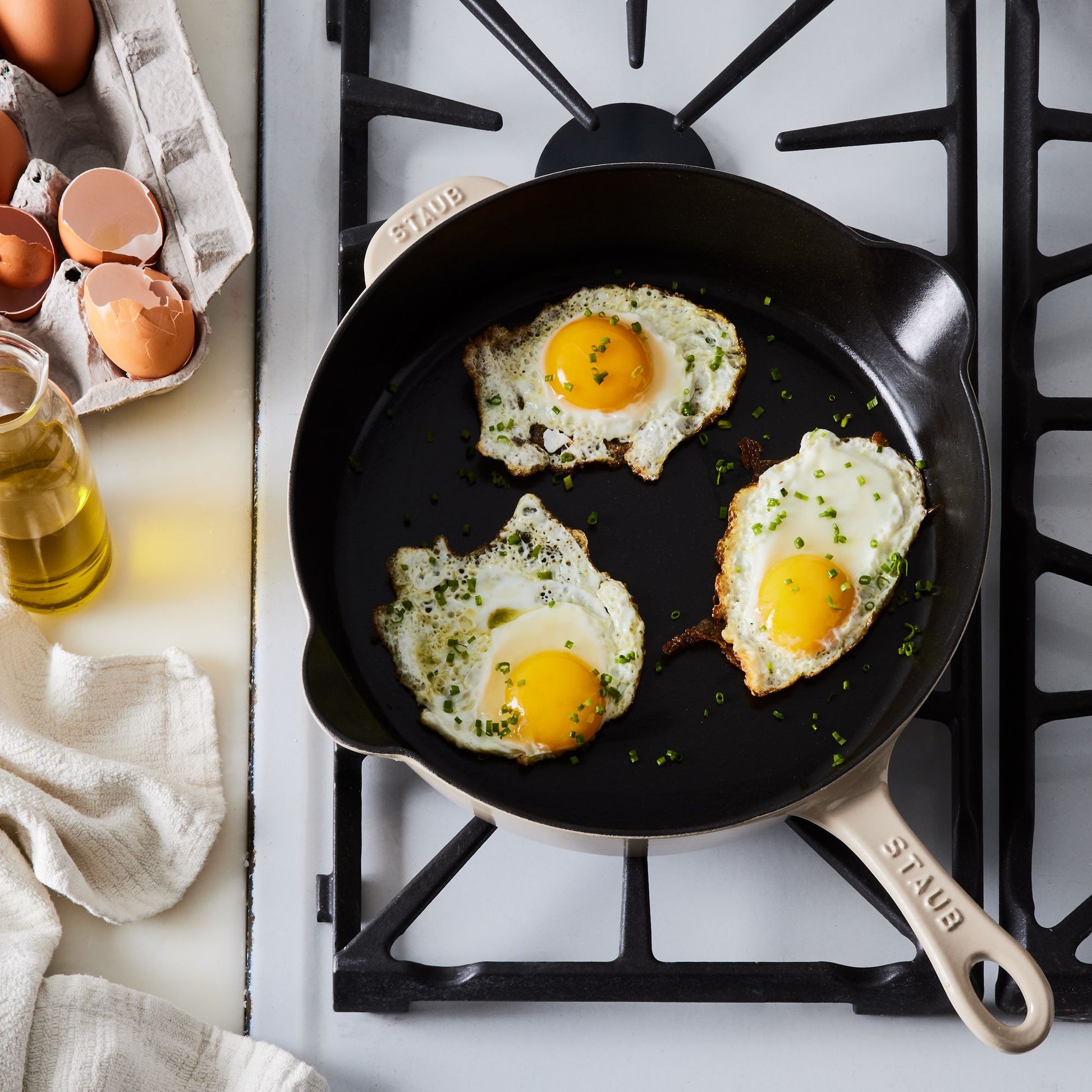- Super slick: This pan has an enameled interior that can fry eggs, sear steak, and brown onions from the get-go, no seasoning needed.