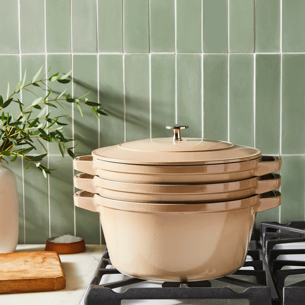 Bet your cast iron can’t do this. Staub’s 4-in-1 stackable cookware set comes with a 5-quart Dutch oven for soups and roasts; a braiser for casseroles and bakes; and a grill pan that gives you serious sear marks. And to top it off: There’s a heavy-duty lid that fits on all three.