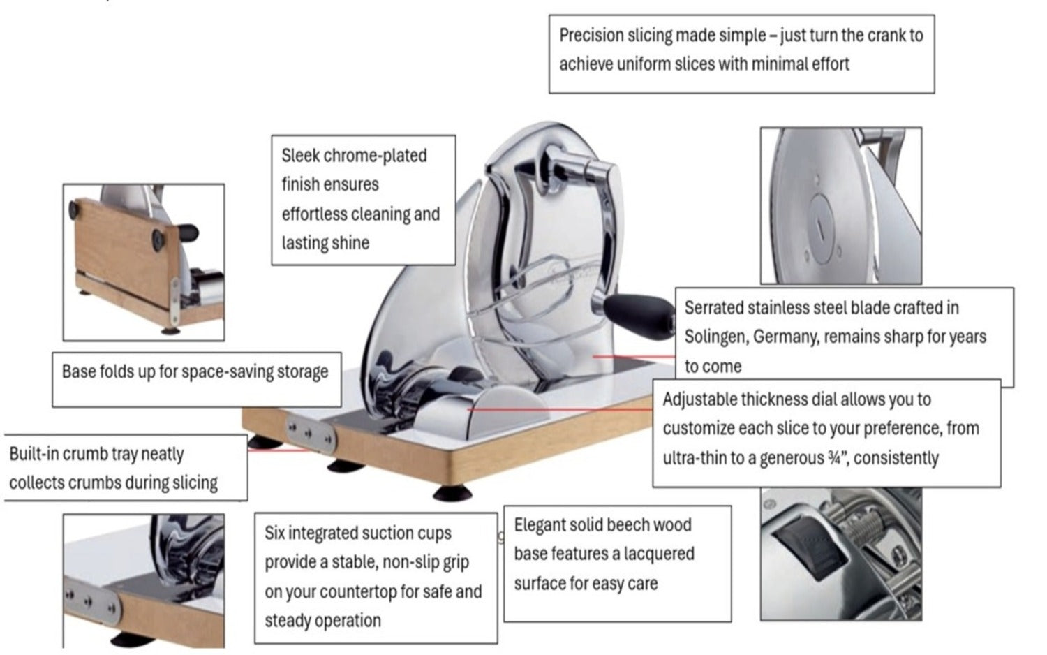 Whether you bake your own artisan sourdough or prefer to purchase whole loaves, this slicer offers unparalleled precision. Home bakers will especially appreciate its ability to create uniform slices that honor the integrity of their handcrafted bread. The “Vintage” slicer provides full control over every slice.